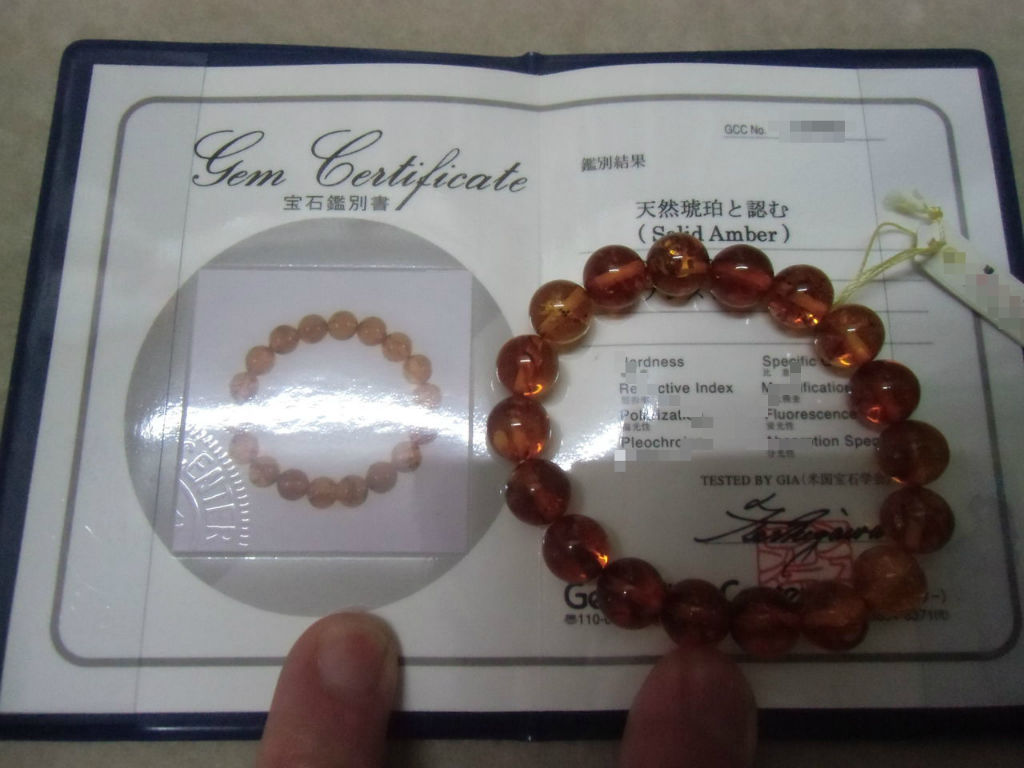 そしてもう一品宝石鑑別書付きの天然琥珀ブレスレットです。