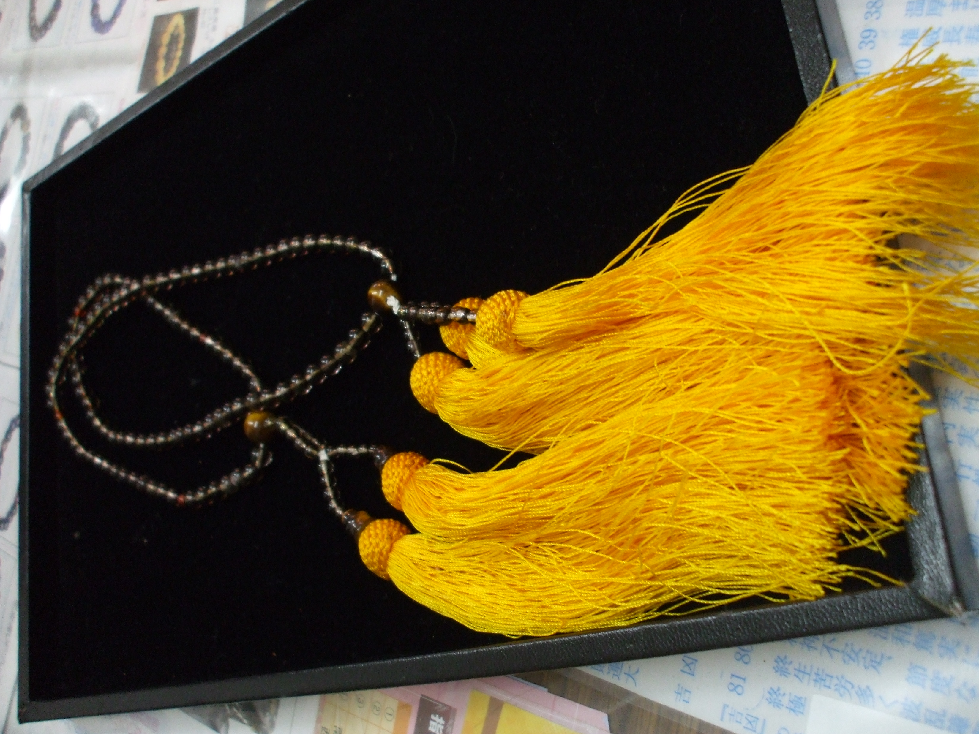 1つの念珠に房が5つ。うちの店にも念珠はありますが、だいたい1つの念珠に房2つというのが多いです。今回作らせていただいた物は、お見かけした事のない物だったので、ご本人に了解を得て写真に撮らせていただきました。