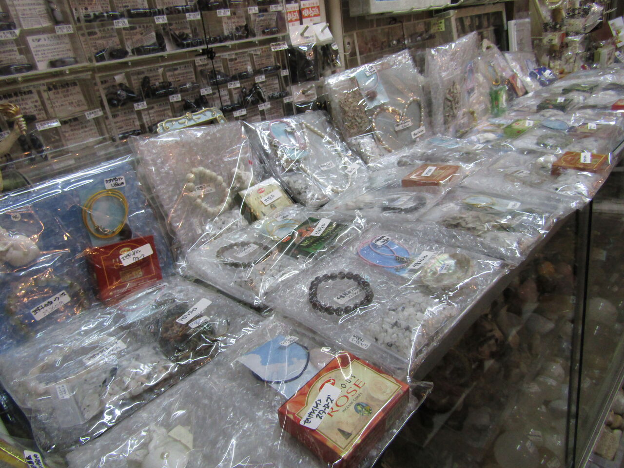 店に入って右側のビーズコーナー下には原石の福袋が並んでおります。